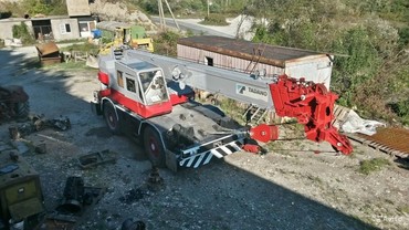 Автомобильный кран, с возможностью башенного крана. В исполнении башенного крана высота подъёма 30 метров, глубина подачи в здание 15 метров, грузоподъемность до 10 тонн (на вылете 1-5 метров), 3 тонны (на вылете 5-10 метров) 1 тонна (на вылете 15 метров). Очень удобен для проведения монолитных работ в стесненных условиях строй площадки (старая застройка города), кран может перемещается по строй площадке, для переезда по стройплощадке необходимо 10 минут, что бы сложится в транспортное положение и 10 минут разложится на новом месте. TADANO TR 250, грузоподъемность 25 тонн, грузоподъемность на максимальном вылете 26 метров 1,1 тонна. Длинна стрелы 30 метров, длинна стрелы с удлинителем 44 метров, при работе с опалубкой для монолитных работ обеспечивает подачу опалубки на 9 этаж с глубиной подачи до 16 метров