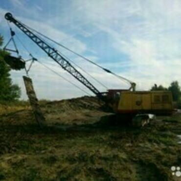 Тросовый экскаватор, длина стрелы 13м, объем ковша 1м3, предназначен для устройства и очистки берега водоемов, каналов