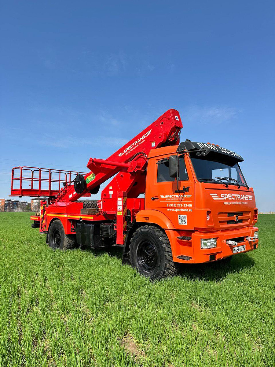 Автогидроподъемник на полноприводном шасси повышенной проходимости на базе КАМАЗ 43118. Предназначена для работ на высоте в труднодоступных и труднопроходимых местах, таких как лесополосы, заболоченная местность и строительные объекты.