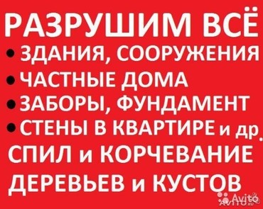 Выполним любые виды Демонтажных работ: демонтаж потолков, перегородок, пеноблоков, гипсо блоков, стяжки, паркета, перекрытий, ламината, бетона, гипсокартона, вагонки, бруса, подготовки к работе, подготовка квартир к ремонту, щитовых домов, окон, откосов, вентиляции, слом дачных домов, сараев, заборов, плинтуса, Сантехники, электрики.